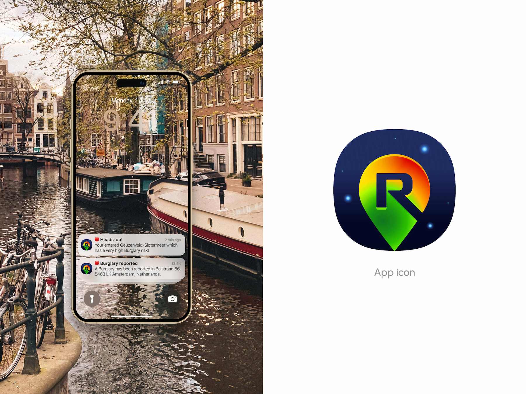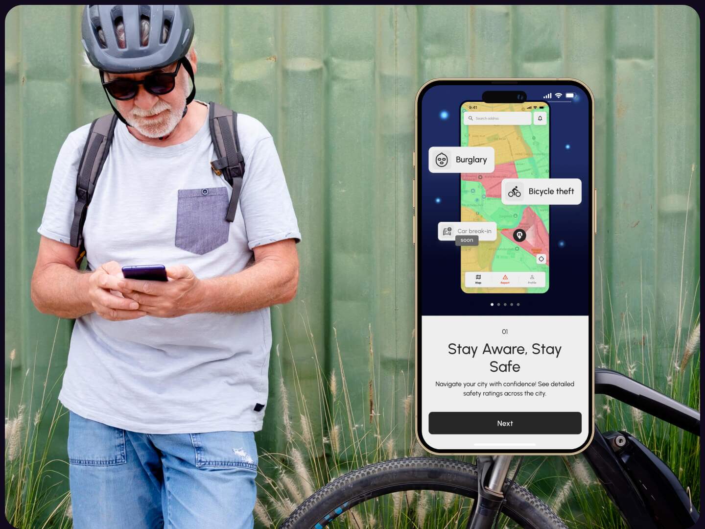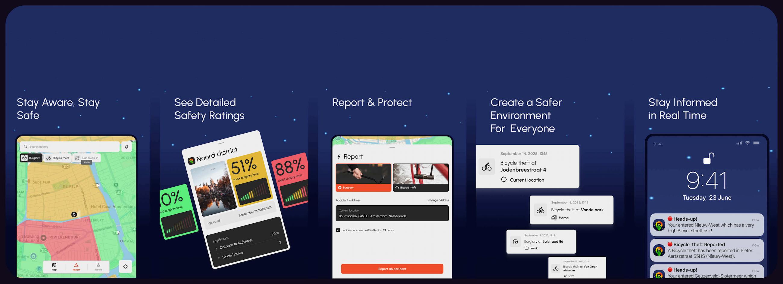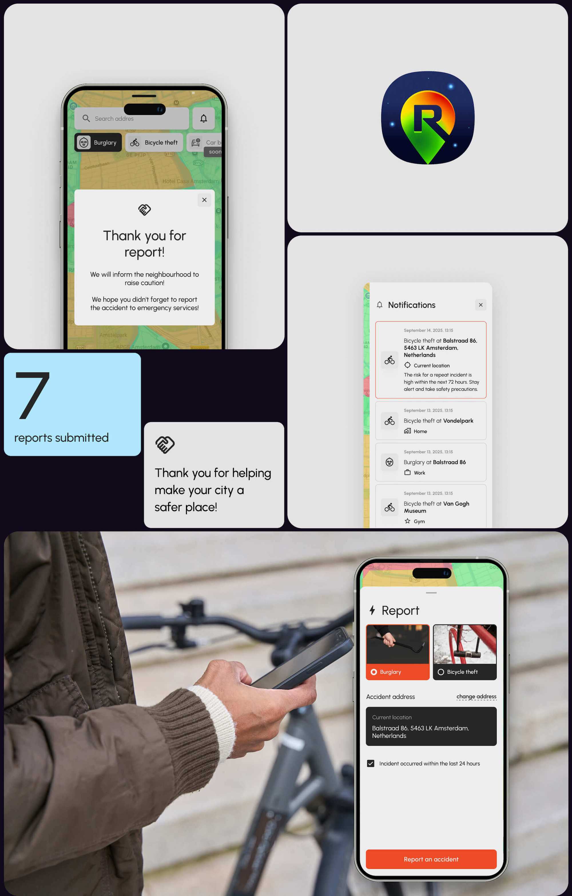 The idea of the app was provided by the risk assessment professionals from the top tier European insurance company. The users of app should be able to get real time notifications in case they enter the zone with higher risks (burglary or bike theft). The risk is calculated based on the proven governmental data, police reports and AI that is trained upon a number of criteria. Every user can also report an accident warning the neighbours. All that was an ambitious functionality meant to be packed into a very simplistic and intuitive interface.